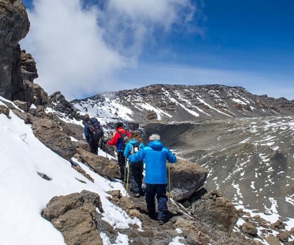 Wake up before midnight in the cover of darkness. We begin a steep climb over loose volcanic scree has some well-graded zig-zags and a slow but steady pace will take us to rim of the main crater, Stella Point, at 5,735m. We will rest there for few minutes to enjoy the sunrise over Mawenzi. Those who are still feeling good can continue slowly to make the two hour round trip from here along the crater rim to main peak (5,895 m), which is the highest point in Africa. After a few minutes to appreciate your accomplishment we descend to Barafu is amazingly fast, and we stop at Barafu Camp for some refreshment, we continue to descend to reach Mweka Camp. Barafu Camp to Summit to Mweka Camp (3100 m): 13-15 hours walking.